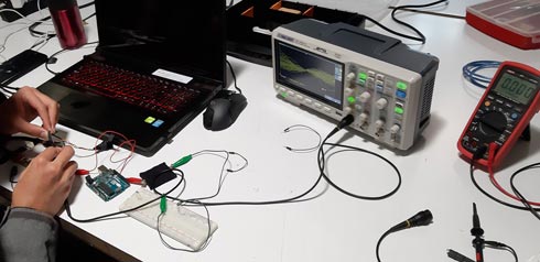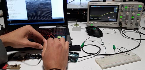 On this week we tested a potentiometer as an input on the previously designed and produced BoredBoard. We tested a code in Processing to have a 3D visual representation of the potentiometer's interaction while checking it on the oscilloscope's interface.