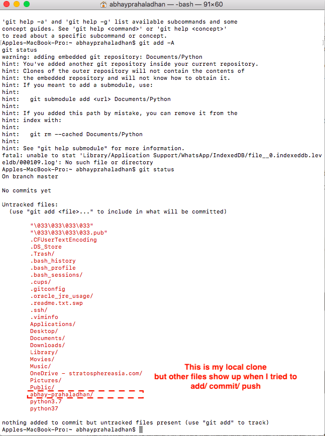 Since I wasn’t familiar with command line, I ended up installing Git in my root folder. This creates an issue while trying to commit local files to repo. A small piece of code I missed was this: