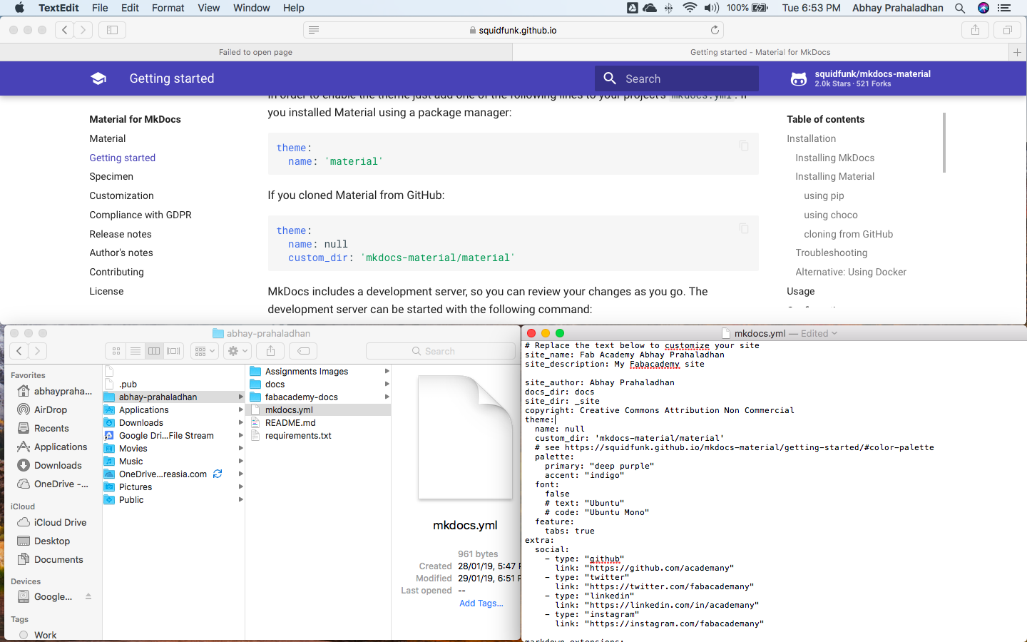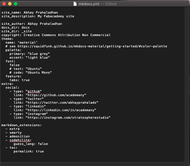 I edited the .yml file using textEdit to setup my MkDocs website theme. I’m new to HTML and website coding and I’m trying to evolve the website further.