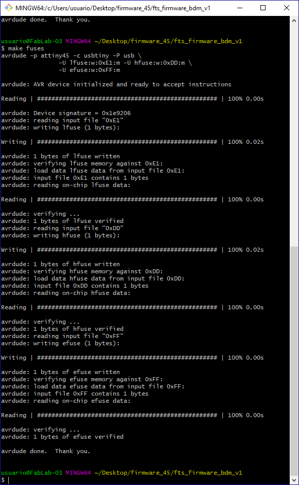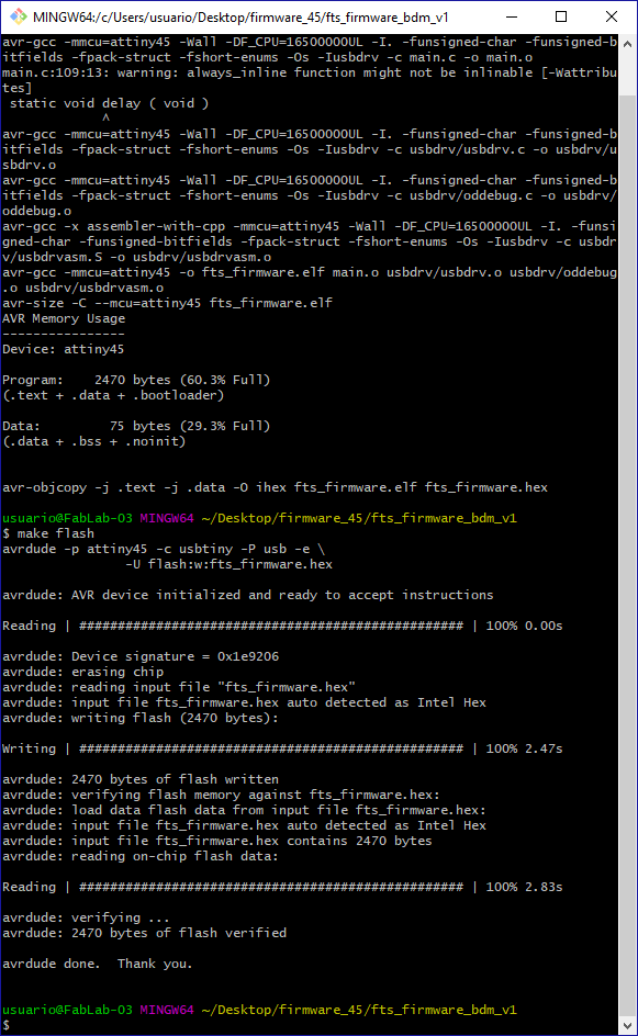 It generates a file called fts_firmware.hex.- Program the ATtiny45