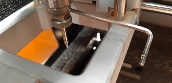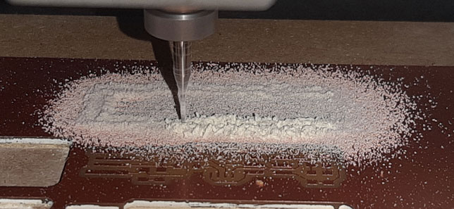 Check operation and results > Use VIEW button on VPanel to bring closer to the door the machine’s bed. Check mill tip and material depth worn (copper layer must be completely removed at the design black zones, and both the coloured copper dust and the white board dust must be seen to ensure the milling job was succesfuly done)