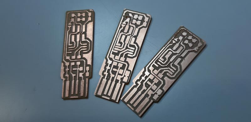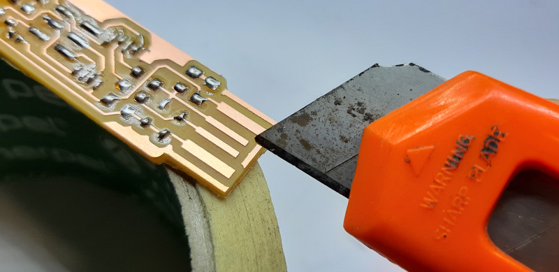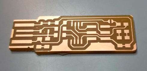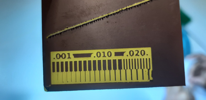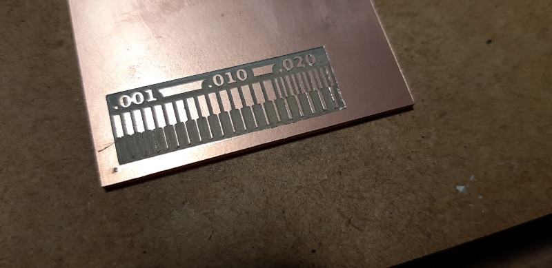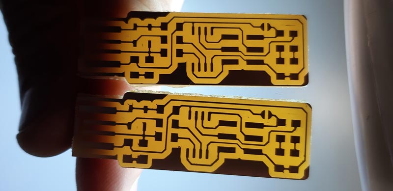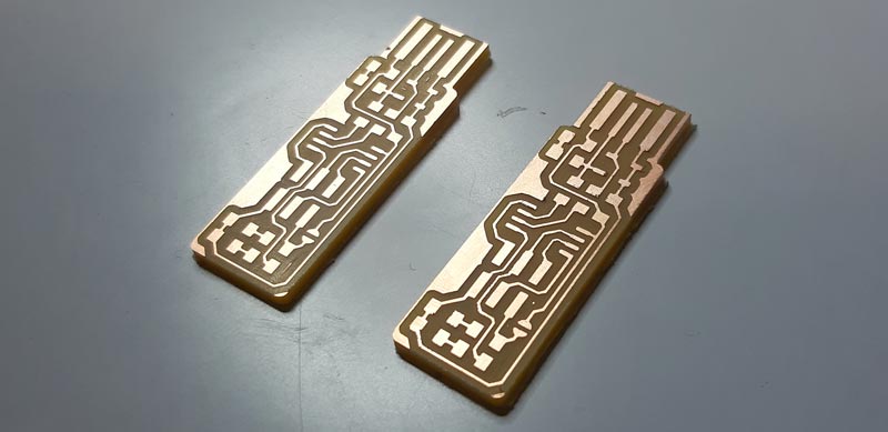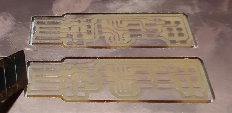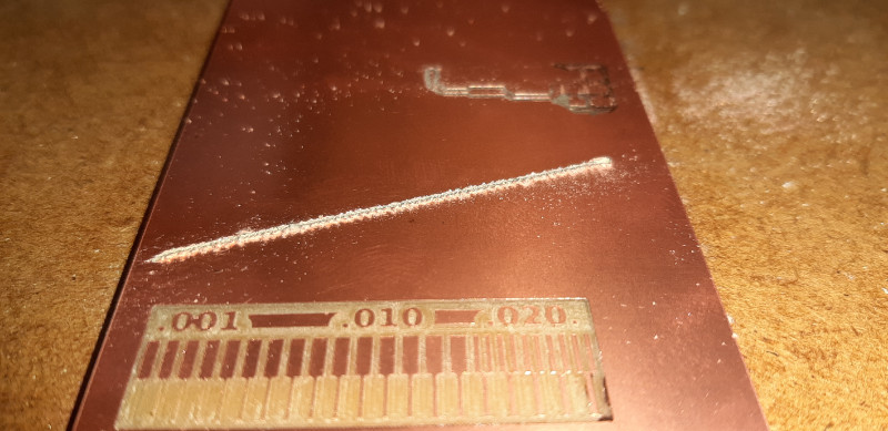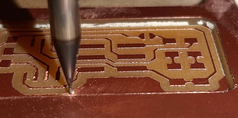 These are the 0.4 mm (1/64’‘) tracing and 0.79 mm (1/32’‘) cutting-off PCB milling results: