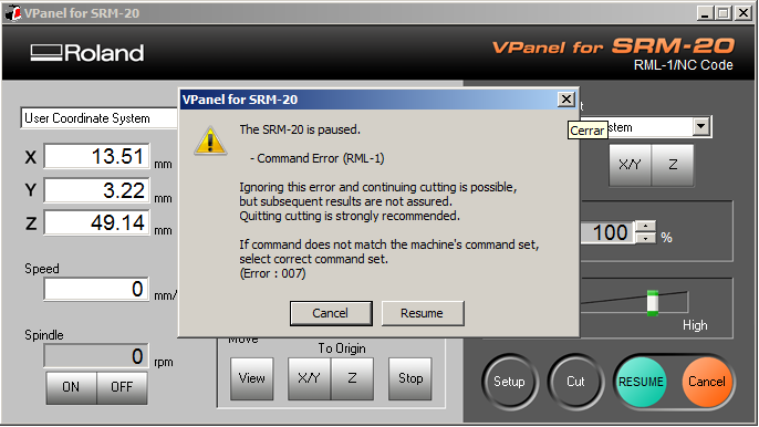 Sometimes, when using Roland monoFab SRM-20, the job stops and Vpanel reports this error pop-up during the milling process.