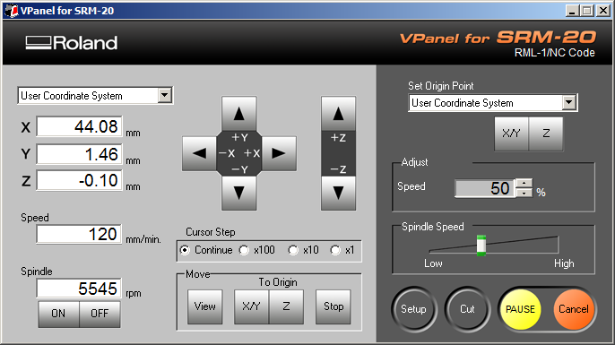 - Watch job and wait it to be finished > Use speed controls to modify spin and axes velocity (warning: consider milling rules exposed). Use ‘PAUSE/RESUME’ to stop the job for a while. Use CANCEL to clear the running job