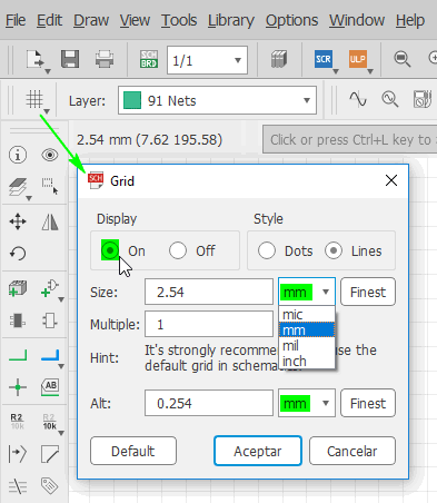 I turned on the grid and set it up to 0.4 mm, which is the mill thickness to use for tracing process.
