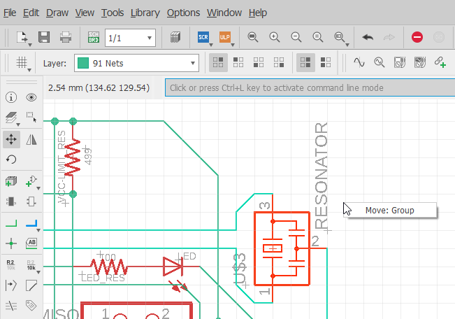 Eagle is a little bit special on using some tools; for example, ensure to click on the thin cross that any component has to use tools on it.To ‘Group‘ objects to “Move” them at once, you need to group them first and then right click on white space to use ‘move group’ tool: