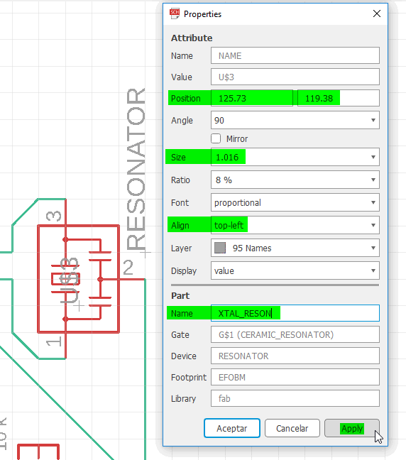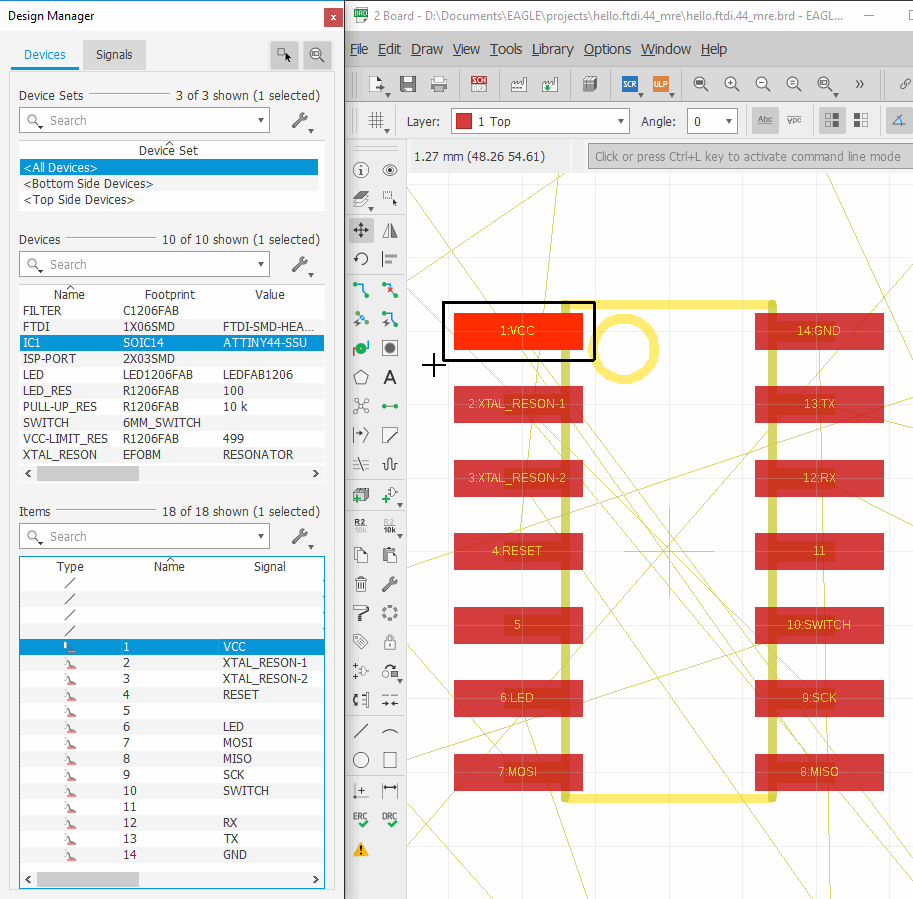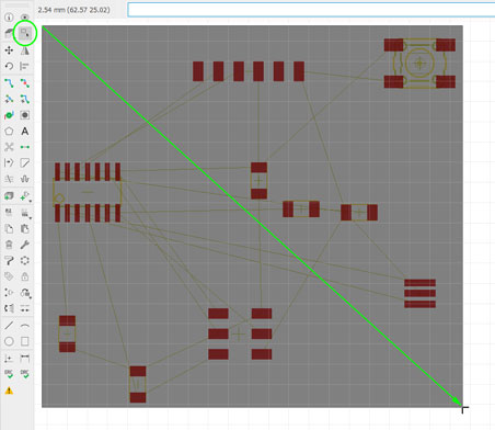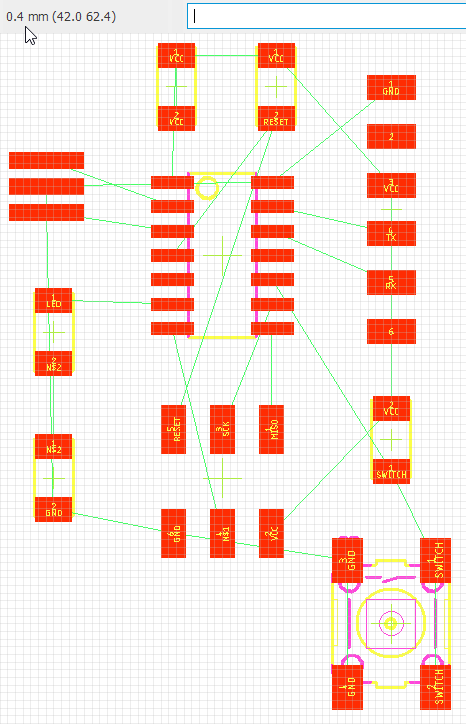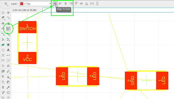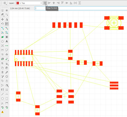 Turning to Board mode, it was so useful (and recommended) to ‘Align‘ all components to the grid. By this way, and setting it up to a similar/lower mill thickness multiple, I ensured to put all traces where I needed/wanted without compromising my future board traces.