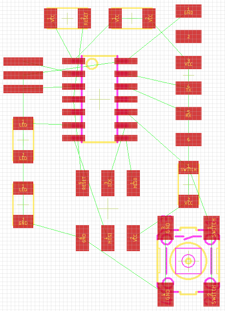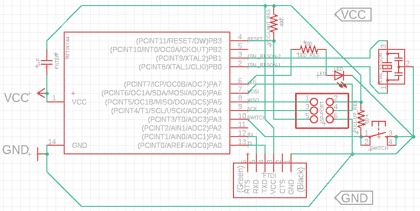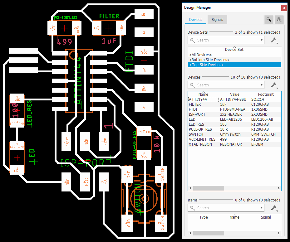 I had to design and produce an echo hello-world PCB which, at the end, has a programmed ATTiny44-SSU microcontroller able to return a ‘hello-world‘ output. I also integred to the system a LED controlled by a Switch.