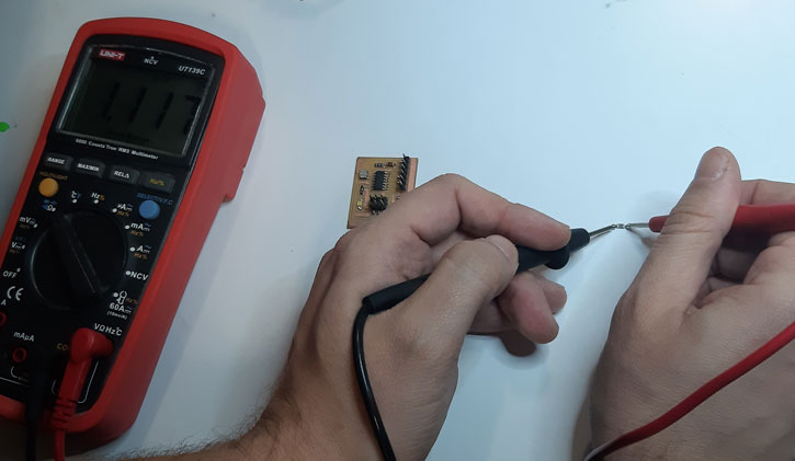 Continuity tested with multimeter from ATTiny 44-SSU VCC/GND pins to 3x2 header VCC/GND pins. Also I tested the Switch function from ATTiny VCC to GND after the LED with no errors. I noticed that LED didn’t turned on (and will not do it) until the program process would be done.