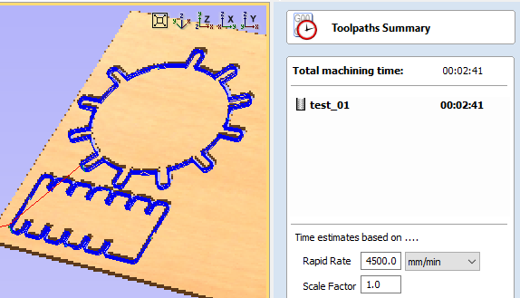 These are the CNC machining settings in Cut2D Pro to cut the design: (see screenshot)