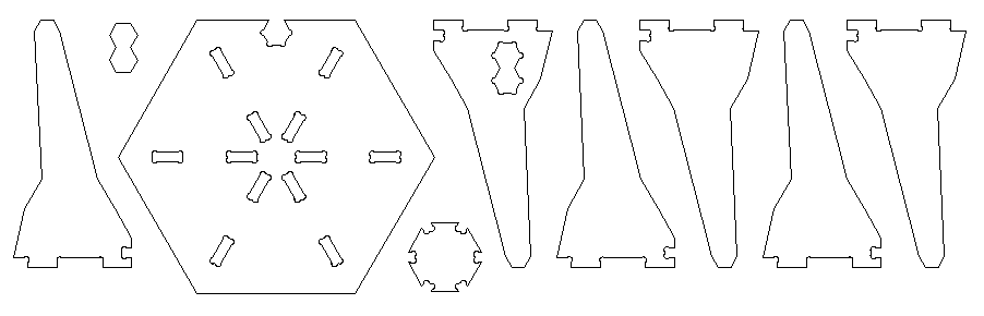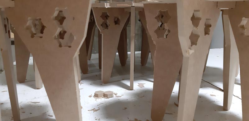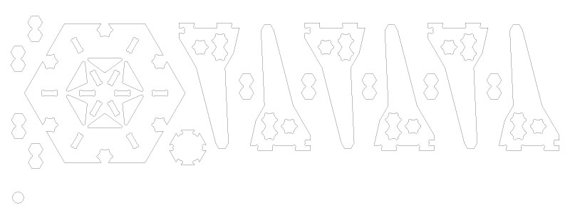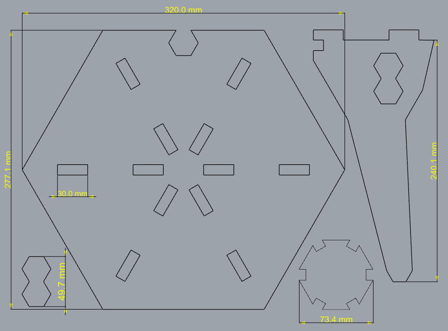 This is the final design, including more joints and pockets on each piece, and also the supports have an additional hole for simple hexagons that could be made on lasercut if it is preffered to close the shapes on the external limits.