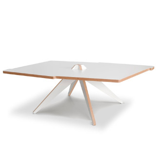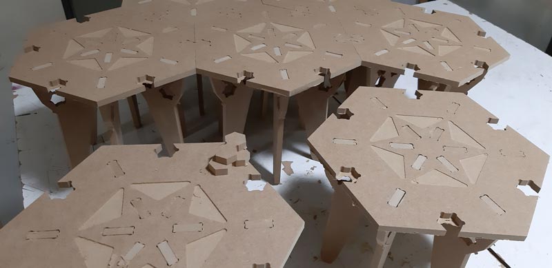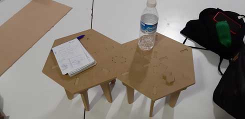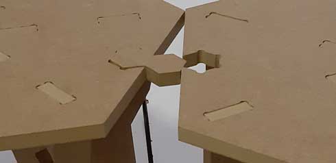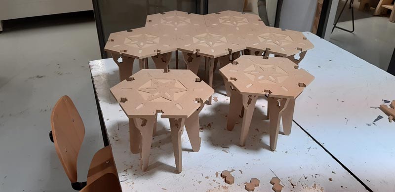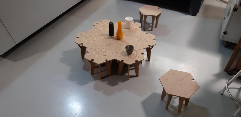 As shown, the idea to connect modules is to use a little piece ‘extracted’ from one of the 6 chair-table supports. That hole also allows to easily pick up and move the module with the hand.