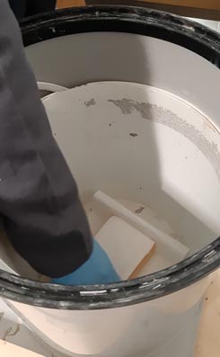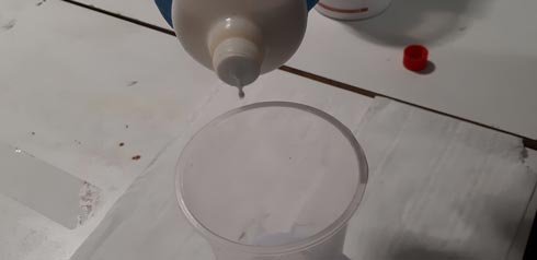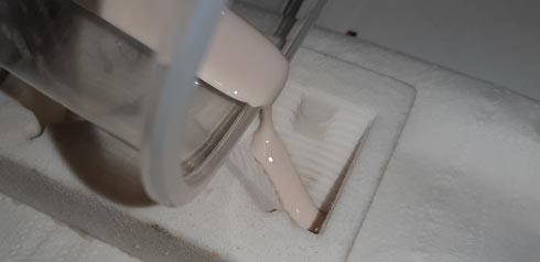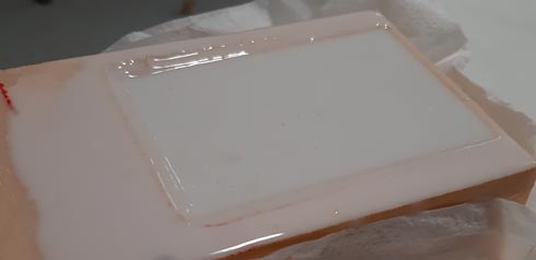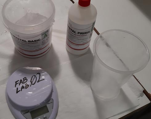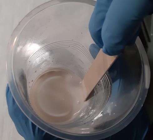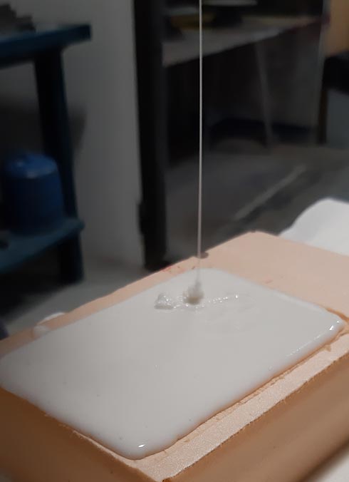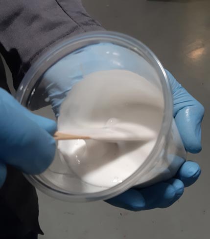 This material, for example silicon, is mixed with other product to have a chemical reaction in order to start a curing process that will change the fluid material into a solid state.