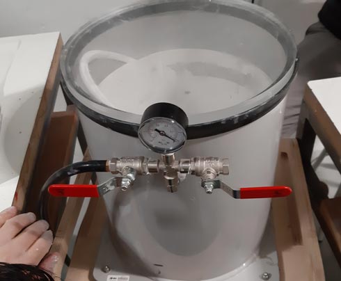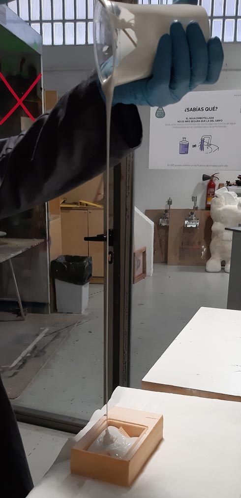 This process has to be made in a few minutes from the mixing step because of the speedy curating reaction. Also, the material has to rest into the mold without bubbles into it. Bubbles could be a problem for the appearence and for strength of the final object. Some methods are used to avoid/extract the bubbles, like settleling the material by numerous hits on the bottom of the mold or with the help of a vacuum machine to push them to the top part.