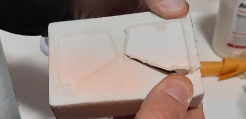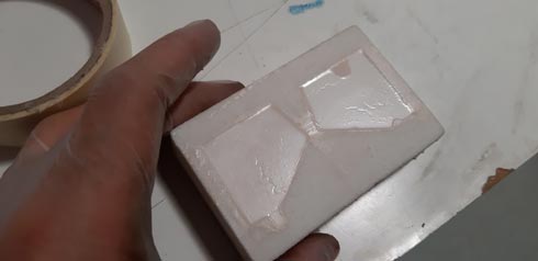 Here is shown another technique. The original shape to be cloned is put on a surface where to give it a ‘silicon shower’. Once the shape is covered and the silicon dry, both are put between 2 wet plaster pieces to obtain a rigid mold of the shape with the external silicon layer. Once the rigid mold is dry, it is separated to remove the original shape from the silicon, and it is closed again with the silicon in between. The final material is poured into the silicon (into the plaster) to obtain the final piece. (Depending on the original shape, this couldn’t be done without using the elastic silicon material)