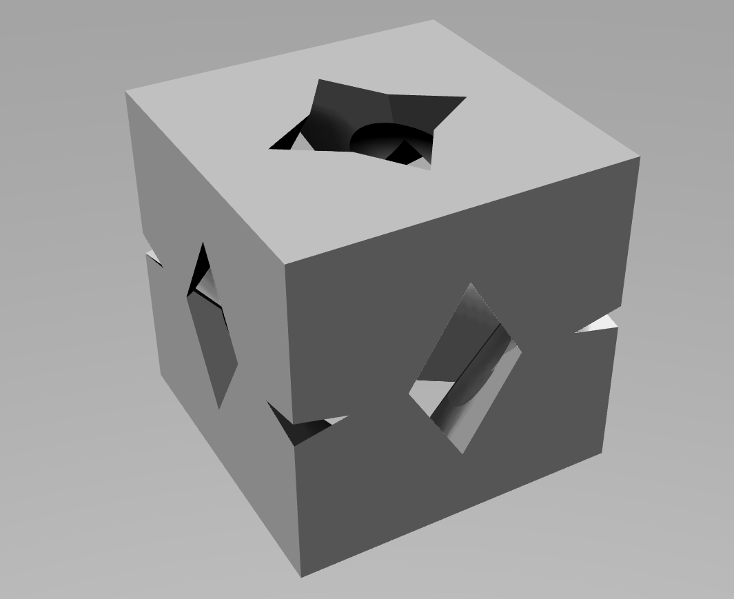 On this time, again, I thought in using modular assembly by designing a unique piece that could make 2 kind of figures just by duplicating and rotating it 90/180 degrees. My design is an 8-part hollow cube.