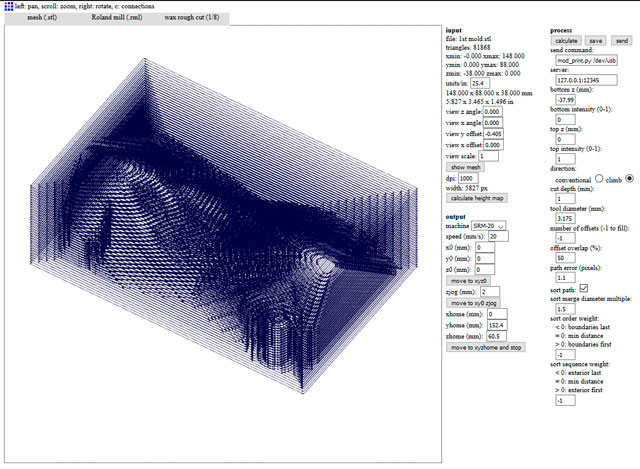 In this case, Roland monoFAB RLM-20 precision desktop milling machine was used on machinable wax. Also, a previous test of the design was made with the same machine in ___ foam in order to test the definition and final result of 3 mm / 1.58 mm mills.