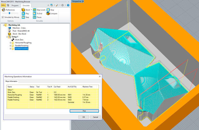 I used RhinoCAM in Rhino 5 to generate the code for the machining. The main steps were: