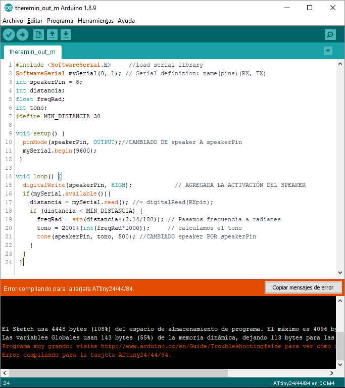 At this point, I tried with the wire and codes and I found an issue: the output code is bigger than 4096 bytes and does not fit into the ATTtiny44 microcontroller.