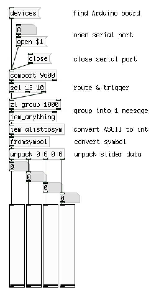 Once the code was loaded on the sensor board, it was the Pure Data interface time.