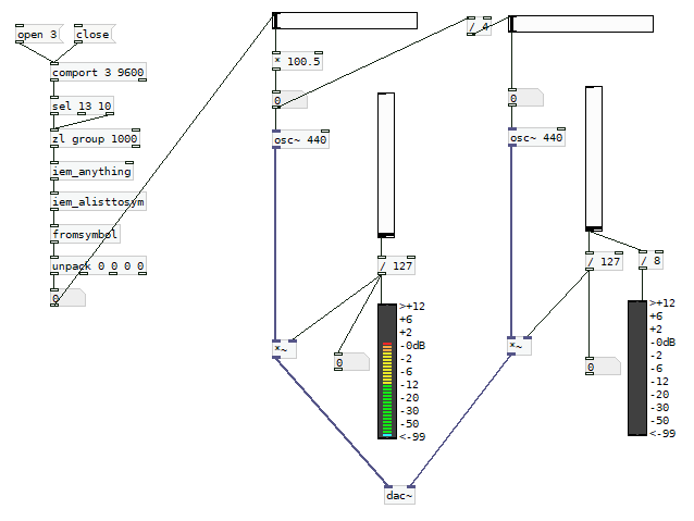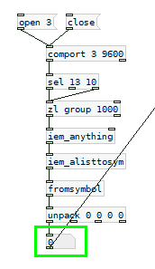 This example was made on Pd-extended (discontinued) version because the last Miller S. Puckette’s “vanilla” distribution (v. 0.49-1) was not working whencomportelement was added to the workspace (although the program files were on the program folder).The element was not generated fully operative when typing