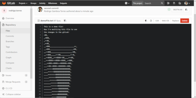 The file I created locally (“demoFile.txt”) now appears in my GitLab! To summarize this tutorial, I added some new text to the local “demoFile.txt” as a second commit and see the changes in the GitLab File. After saving new text to the file, I used again this commands: