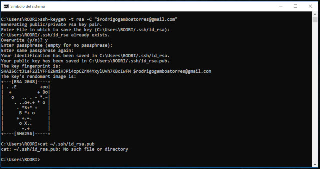 It asked me for some info, I just only replied pressing enter, because I saw in the tutorial that it wasn’t necessary to fill that info. Somewhere in the info that appeared it says “Created directory ‘C:\Users\RODRI/.ssh’“. Then it showed the “key’s randomart image” so I figured I succesfully generated the SSH Key.
