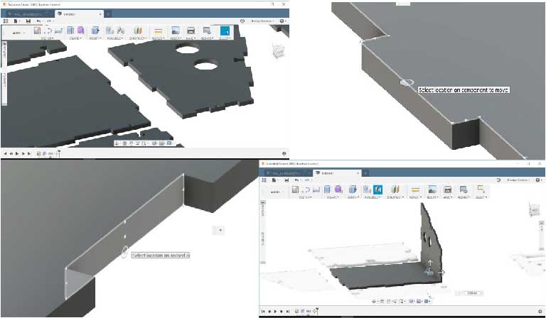 So now the extruded lines are Bodies. You can see them in the left menu. To Join componentes you need to first convert Bodies into Components, so you go to ASSEMBLE>New Component, or you simply click the New Component Icon (the three cubes with a sum symbol). You select the option From Bodies and then select the pieces, you can select many by pressing Ctrl, or by dragging the mouse and selecting the area. You hit OK. On the left menu you should now see the new created Components. Now you can use the function Joint by pressing the ‘J’ key or clicking the Joint j. Joining components could be a little bit tricky at first, so let’s take this example. I need to join these two pieces perpendicularly. So I’ll click an specific part of one of the pieces (the one that you want to move) and then click where it will join in the other piece. As I want this piece to move in a 90 degree angle, I’m gonna click the edge of the top side. Note that a little circle will appear to show the different options. Now you can select the edge of the other piece. The pieces will now join and it will appear an option to move to pieces in any direction if thee assembly didn’t match as you wanted to. I did the same process for every piece.