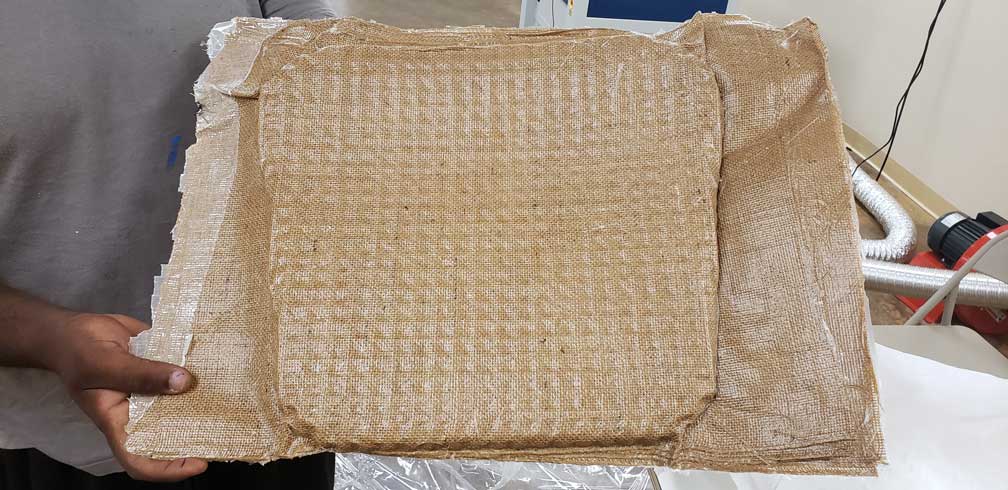 The vacuum was applied for 8 hours, and will need to be removed and excess composite trimmed. Upon first look, I think I could have used more than 3 layers of burlap/resin composite. The cardboard frame, despite the denisty of intersecting cardboard pieces, still had too many gaps (for the 3 layers of composite that I layered) to form a smooth surface. I’ll consider least doubling the number of layers in my next iteration. Either that, or see if creating a mold might be a better process.