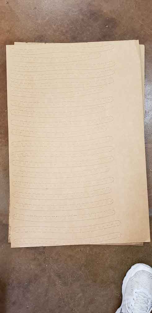 Epilog Fusion Laser Cutting: The manual doesn’t provide specific settings for cardboard (surprising), so I adjusted the settings on each cut to get the laser to cut all the way through the first time without burning the cardboard. As of right now, I’m trying: Speed-25%, Power-45%, & Frequency-80%. Nothing else up to this point (I’m on the 5th of 6 cardboard sheets needed for the frame) has quite done the right job (see images below). I’ll use a razor to remove the pieces when it’s time to assemble it. Update: looks like Speed-25%, Power-50% & Frequency-80% worked well (see last photo). The pieces cut all the way through with just enough connection to hold them in place (adjust as you feel necessary).