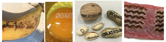 Laser decoration for food such as cookies is very cute. Lots of trials are on the net, and I also tried many types of food. However the reason why it doesn’t spread wide is the decoration is not delicious, I think. Since laser makes it bitter, only sweet cookies with sweeeet cream sandwiched suits for the engraving. During my rapid trial, I found that nuts and bananas are good material because engrave on shell, skin does not affect inner stuffs. And also engraving ‘texture’ onto raw food is interesting for me. It will affect taste and feel when eating.