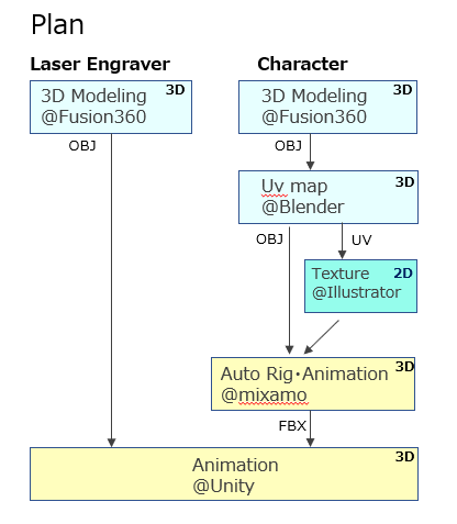As I planned to use 2D software to draw texture of the character, I created the UV map first using Blender. It was a slightly complicated sequence, so I wrote it down below so as not to forget it.