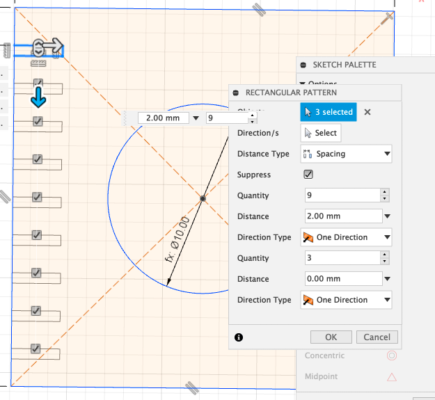To make jagged surface, sketch small rectangle first, then select ” rectangular pattern ” to copy the sketch around it. - Extrude the jagged sketch to make case.