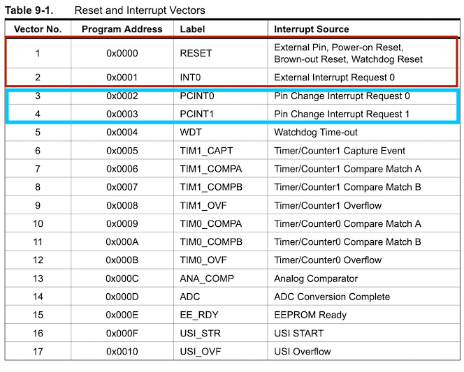 #define serial_interrupt (1 << PCIE0) #define serial_interrupt_pin (1 << PCINT0) // set up pin change interrupt on input pin // set(GIMSK, serial_interrupt); set (PCMSK0, serial_interrupt_pin); sei();