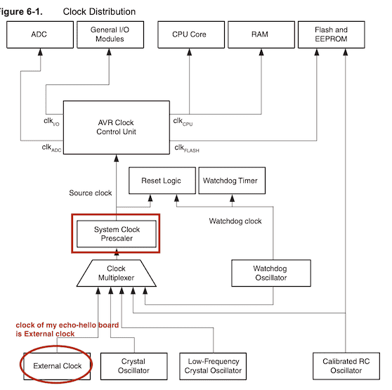I reffered the code example of clock setting in the hello.echo board c. First set the CLKPCE bit to enable Prescaler, then set clock parameters. It is combination of CLKPS0 - 3.
