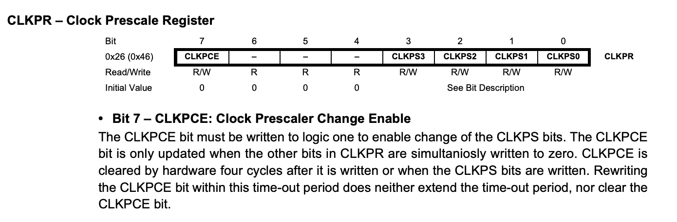 CLKPR = (0 << CLKPS3) | (0 << CLKPS2) | (0 << CLKPS1) | (0 << CLKPS0);