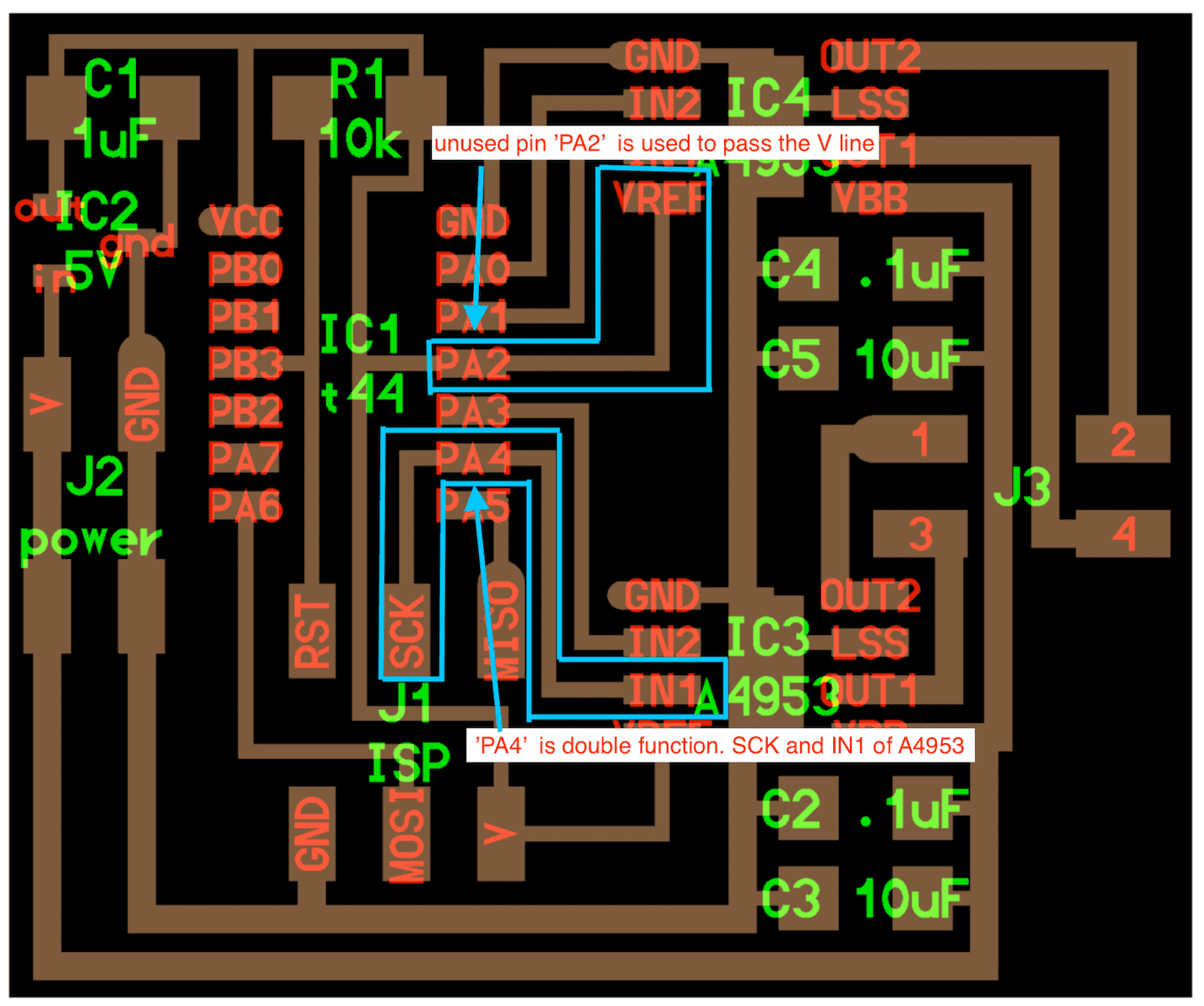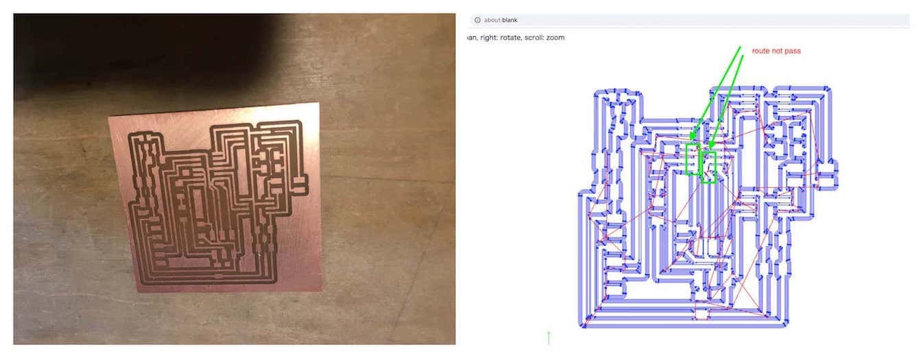 After soldering all parts, I found the path problem. The green area were not routed properly. To fix it, I removed ATtiny44 and cut the route using Ultra sonic cutter.
