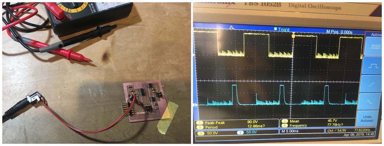 First I programmed simple motor control program to output pwm signal. Before connecting the stepper motor, I measured the output pin of A4953 using oscilloscope. Signals like pwm was outputted though the ground line was very noisy.