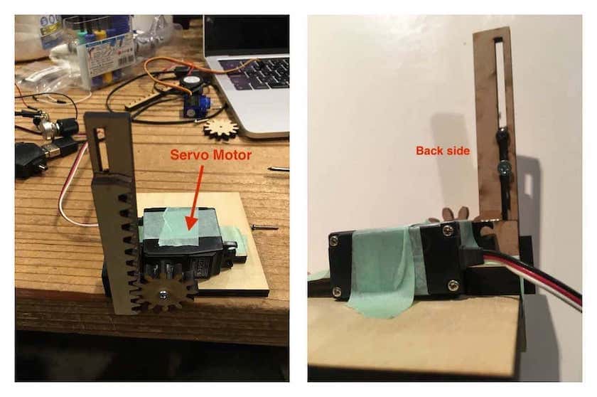 I cut the rack and pinion using laser cutter and combined with servo motor. The torque of micro servo SG90 (1.8 kgf·cm) seemed low for the project, so I chosed Futaba S3001 (4.8v 2.38kgf·cm) from the Kamakura Lab inventory.