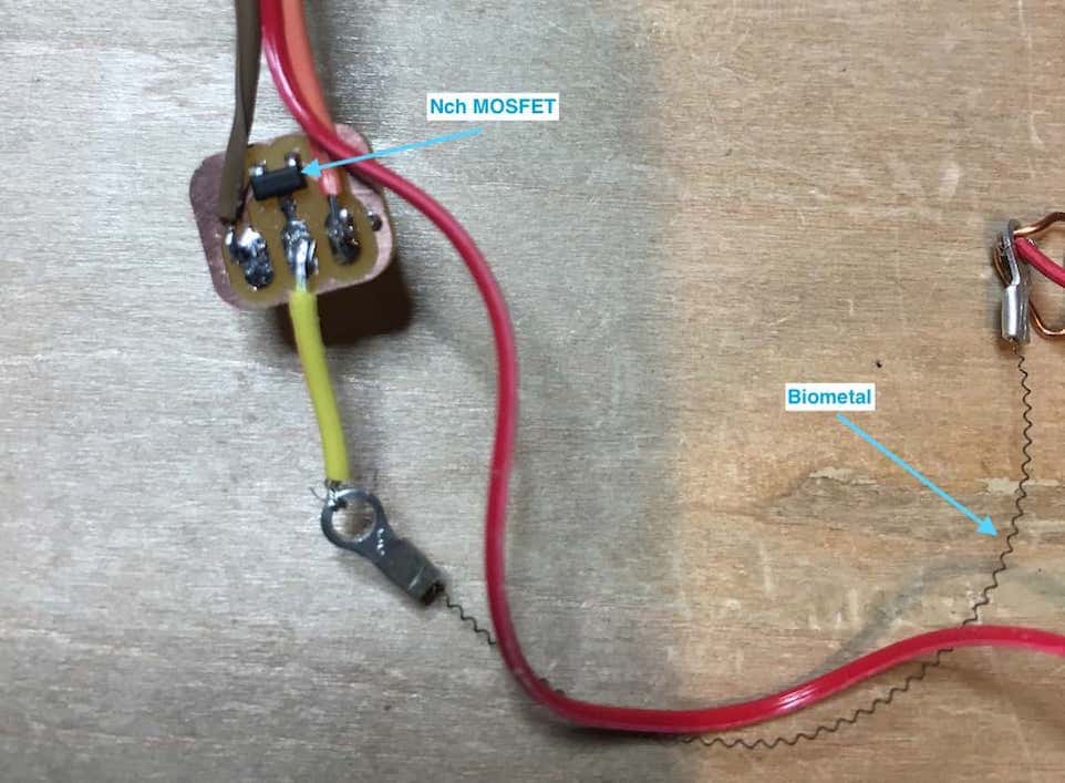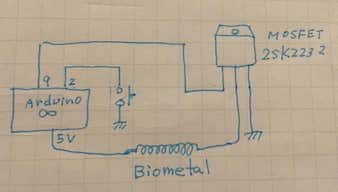 The circuit of the biometal is very simple. The biometal is connected between Vcc and drain of Nch-MOSFET, and the gate is connected to the analogue out of Arduino. The biometal shrinks according to the value of pwm, but the movement is not so big.