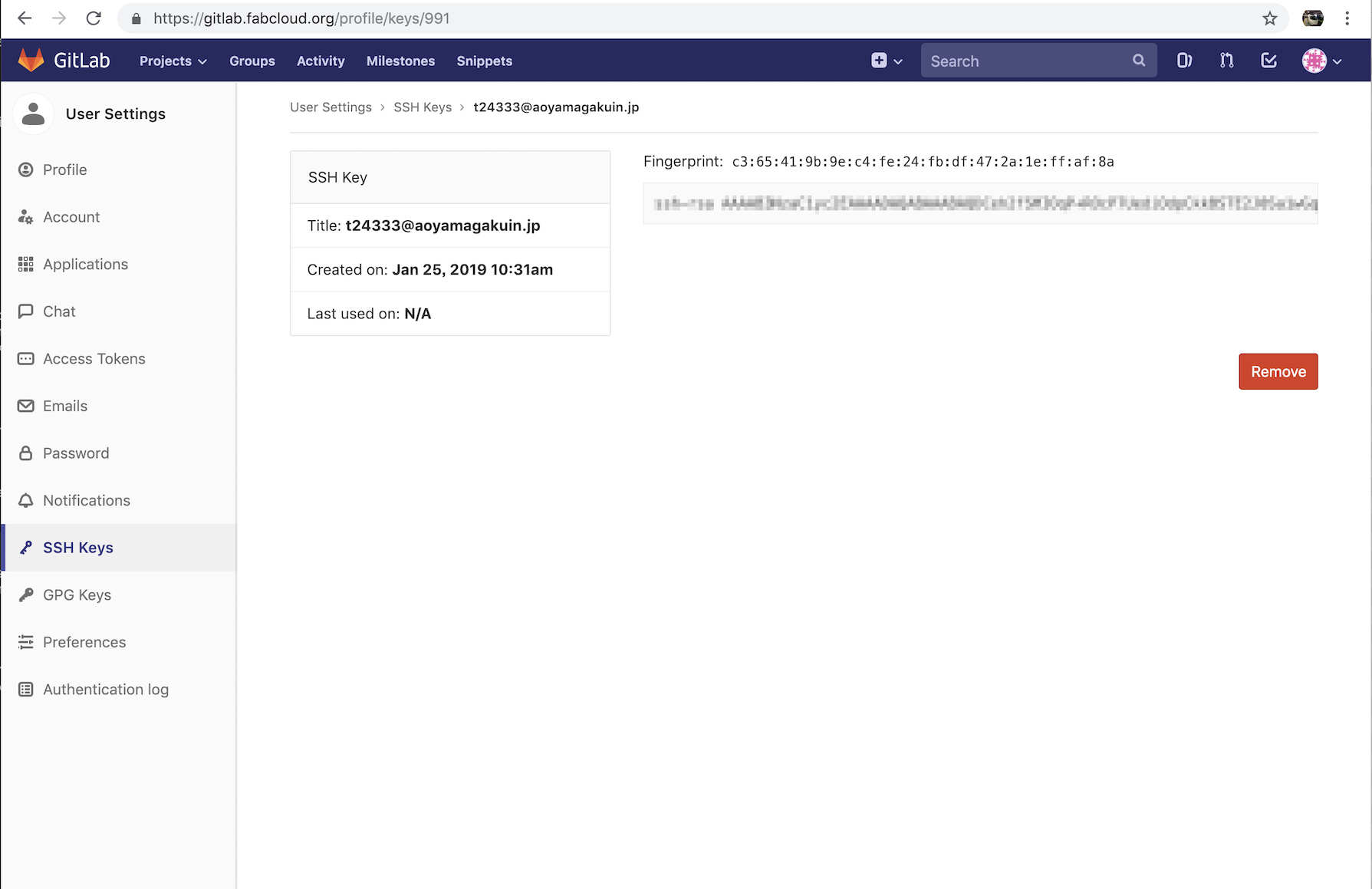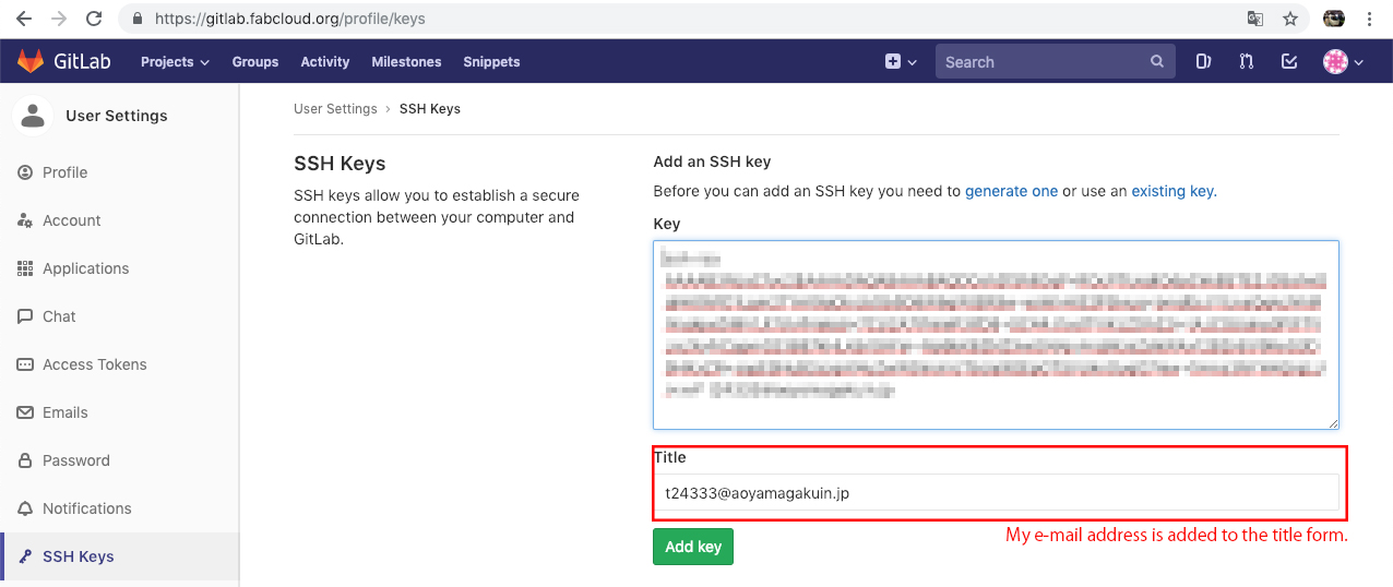 I logged in to the fabcloud, and moved to SSK keys setting page. I pasted public key into the form of key, then pushed “Add key” button. When pasting the key, e-mail address is shown in the title form.