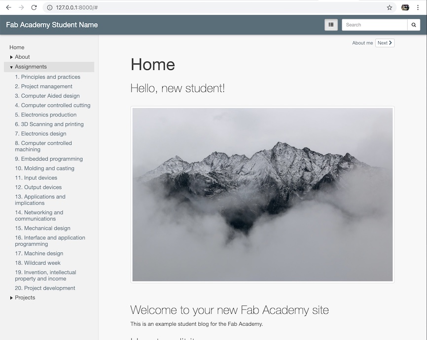 First, with following the installation page, I installed MkDocs on my Mac. Then, to confirm MkDocs works well, I moved to my fabacademy repository, then type “mkdocs serve”.
