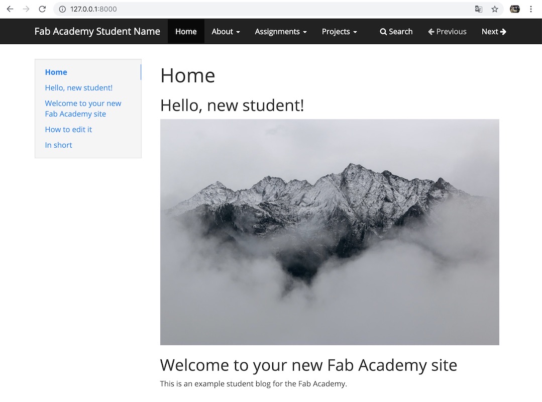 It looks very nice that MkDocs automatically generate website structure as following directory structure. It is also very nice that all markdown files (.md) have been provided in my repository. However, I don’t want to show links to files of assignments that haven’t finished yet in the navigation bar. Therefore, I customized the navigation bar with re-writing “nav” section in modocs.yml as follow.