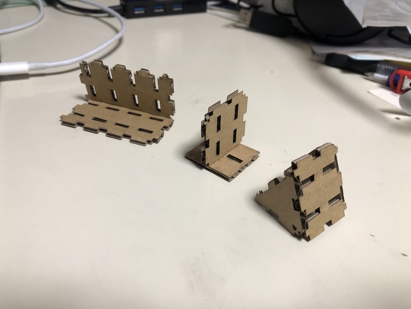 As an assignment of laser cutter, I decided to design cardboard module kits that is something like 2D puzzles or LEGO blocks, and those kit can make something to stand. The basic design of each parts are regular polygon, and there are some nicks on those shapes.