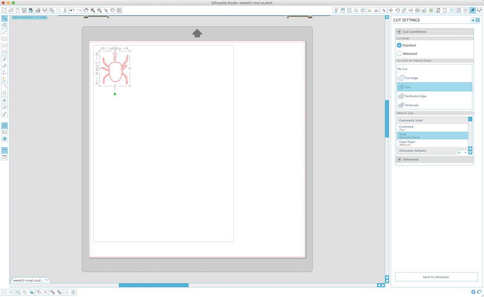 Then, I moved to “Cut setting” mode (and the outline of the logo turned into red), and chose “Vinyl” in Material Type.
