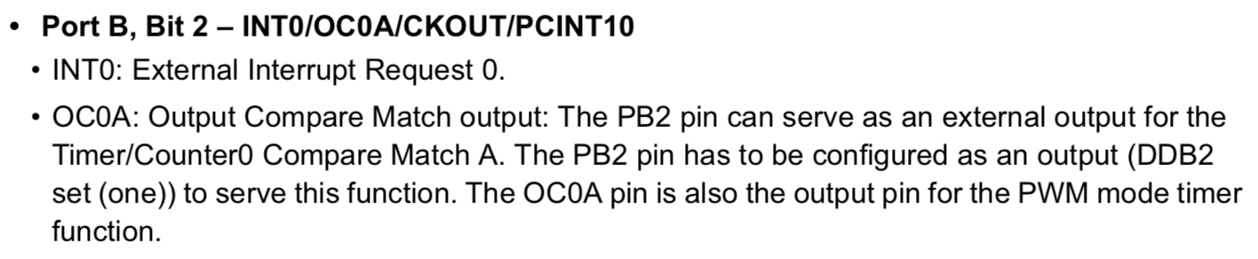 In the description of OC0A pin, it shows “The OC0A pin is also the output pin for the PWM mode timer function”.