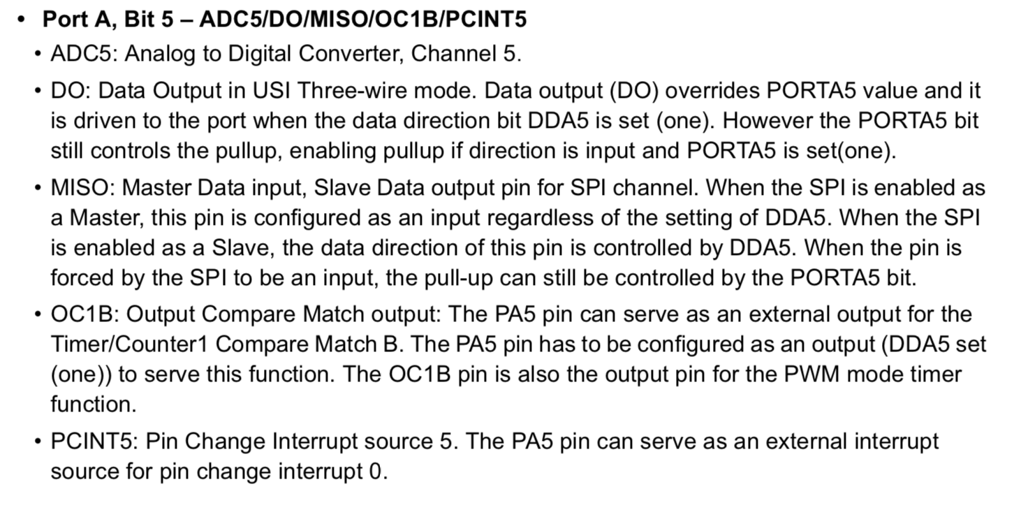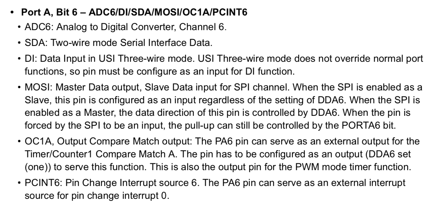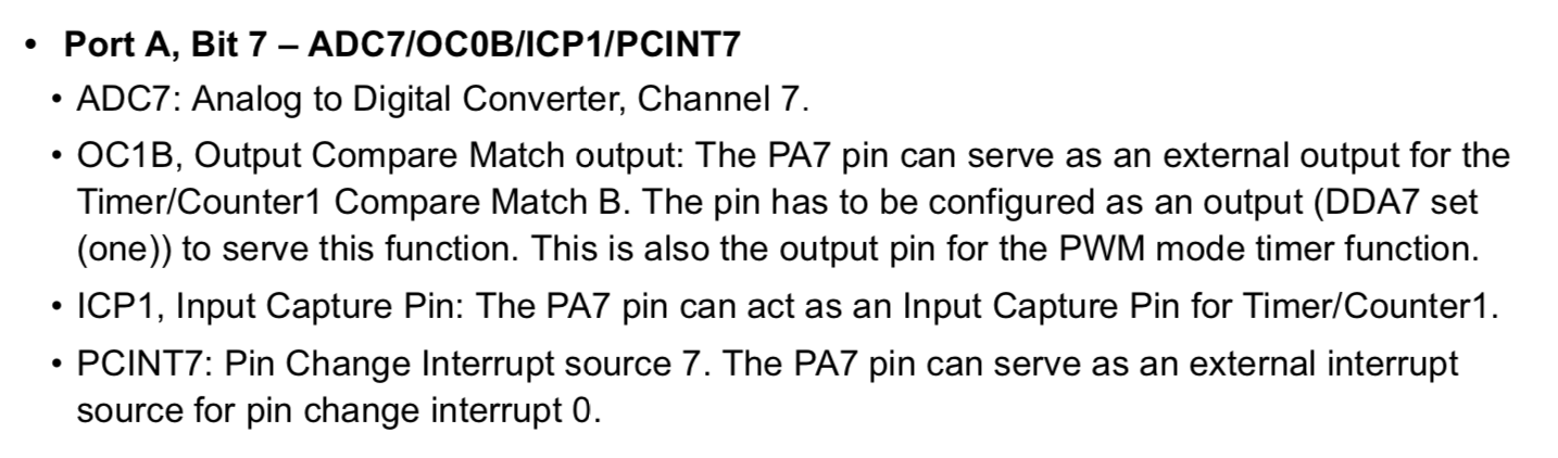 - Only Port A has alternate functions as analog inputs for ADC, analog comparator, timer/counter, SPI and pin change interrupt. If I want to use Analog Input/Output, I have to choose Port A.