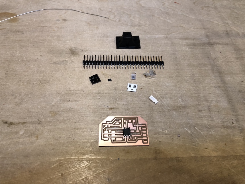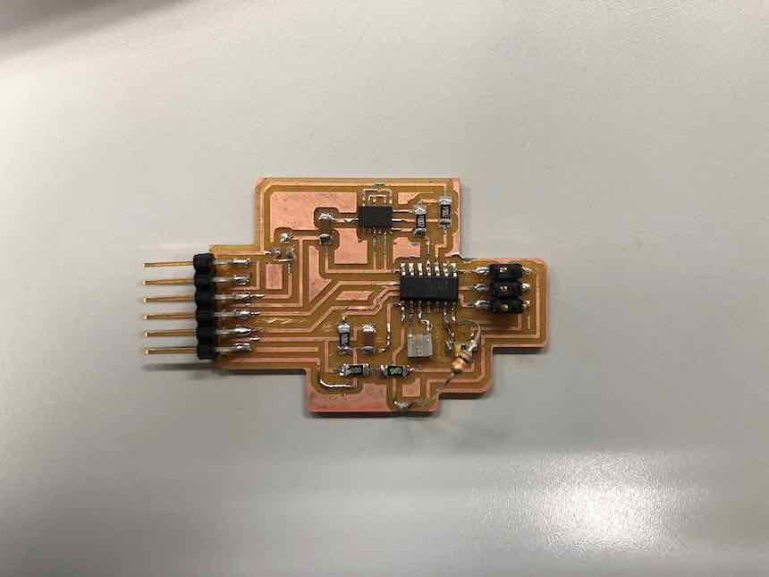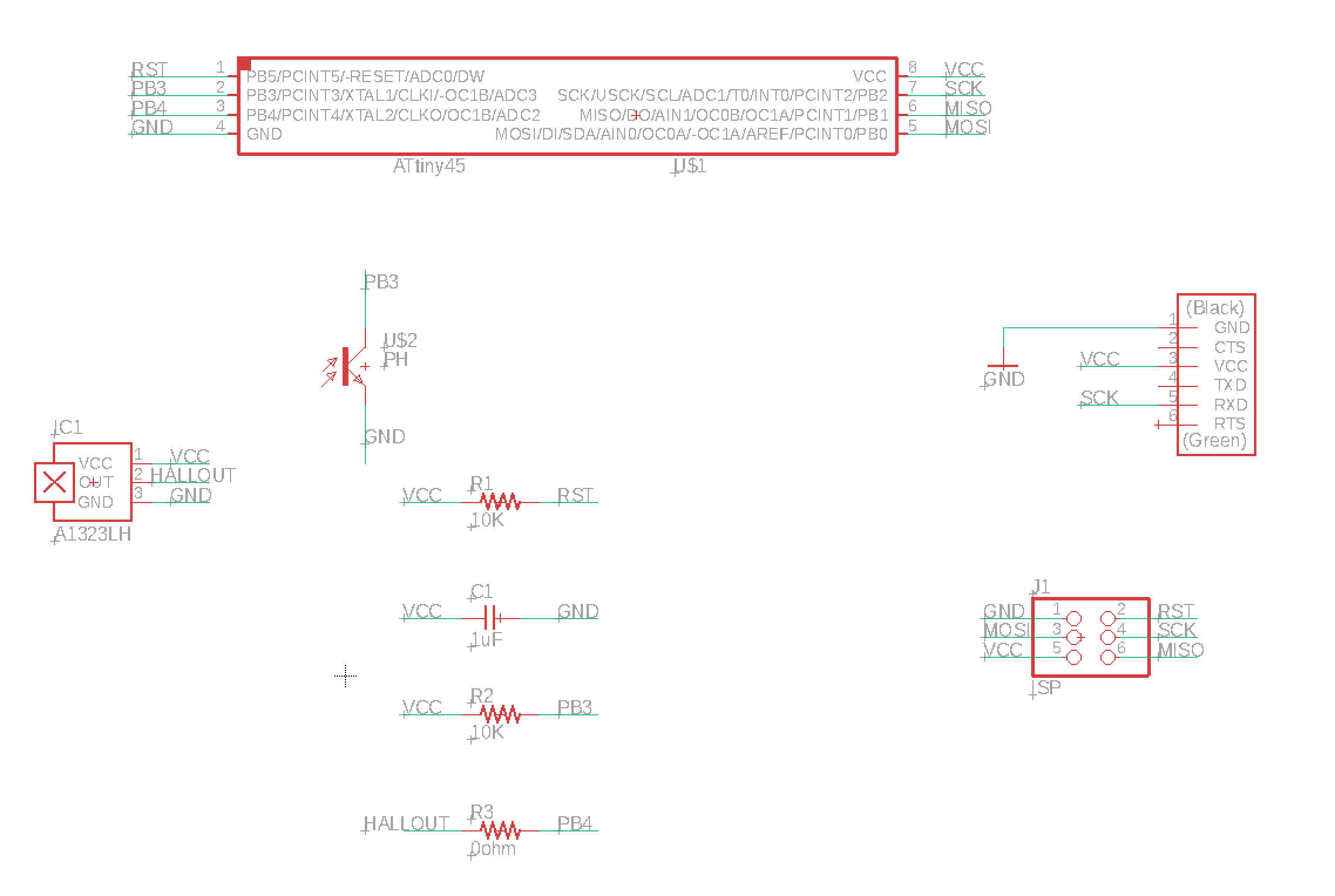 In these sample boards, PB4 in ATTiny45 is connected to Hall Effect and PB3 is connected to photo-transistor. Here is the shecma of the 2nd board by Eagle.