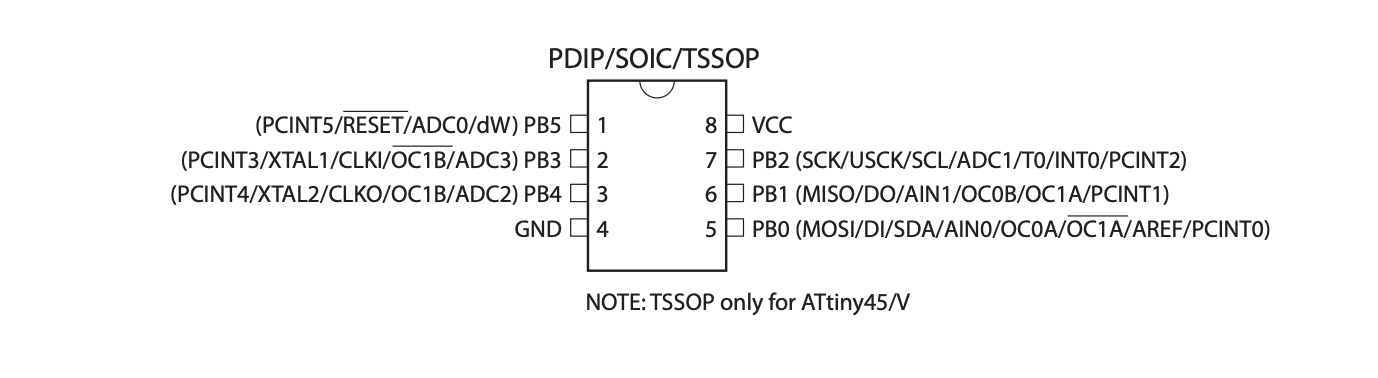 As same with ATTiny44, I checked the datasheet of ATTiny45 to find out which pins are assigned as A/D converters.