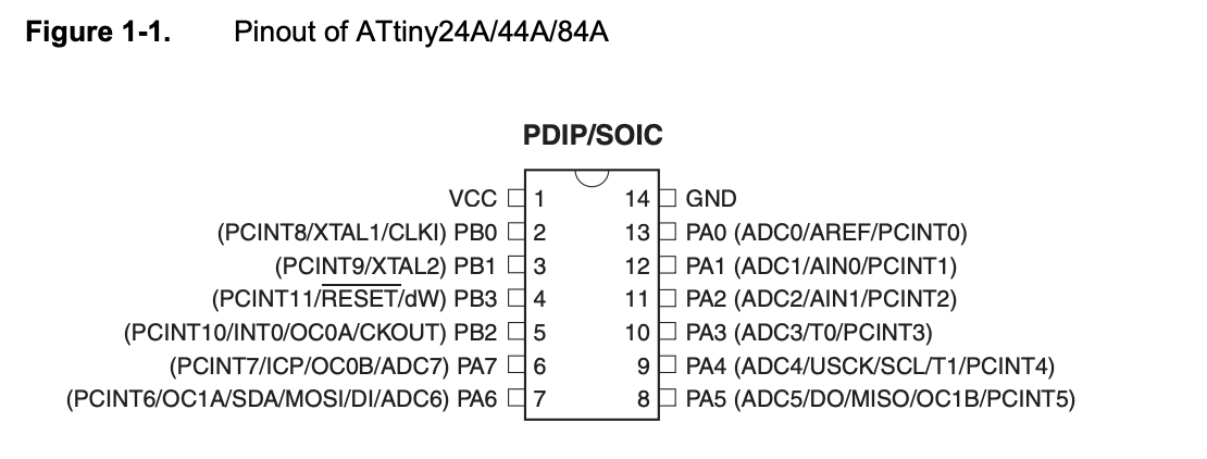 I used ATTiny44 in this board. The datasheet is helpful to check out pin configurations, which pins I can use for A/D convertion.